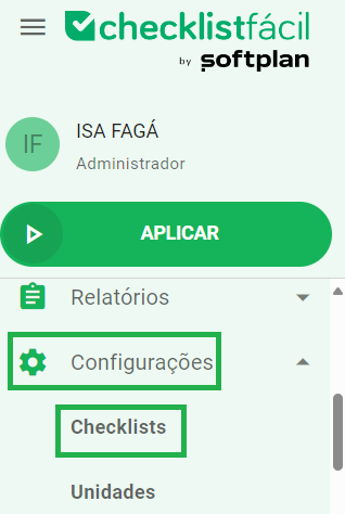 Passo 1: No menu lateral esquerdo do sistema, clique em Configurações e, depois, em Checklists.