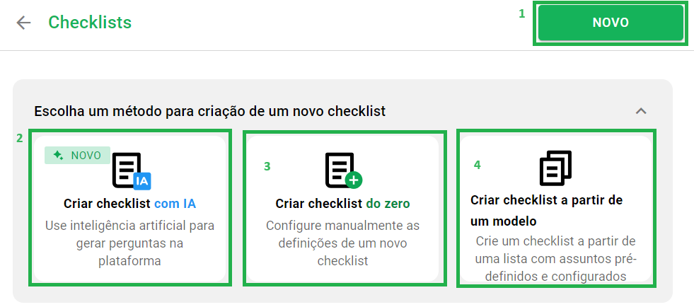 Passo 2: Existem 4 maneiras de você criar um checklist: (1) Novo, (2) Criar checklist com IA, (3) Criar checklist do zero ou (4) Criar checklist a partir de um modelo.