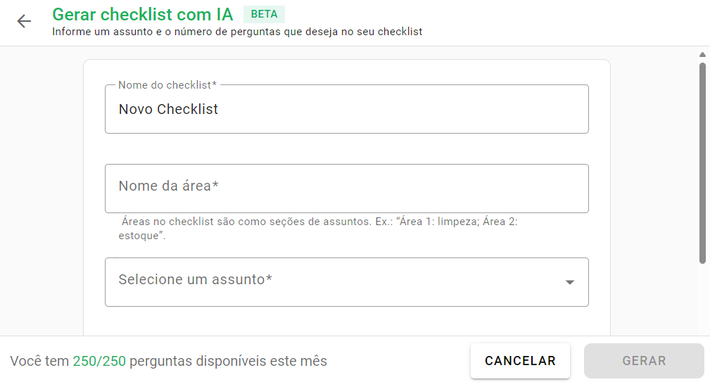 - (2) Criar checklist com IA: esta opção possibilita que você utilize inteligência artificial (IA) para gerar perguntas automaticamente. Basta dar um nome, digitar a área, selecionar um assunto e a quantidade de perguntas (máximo 250).