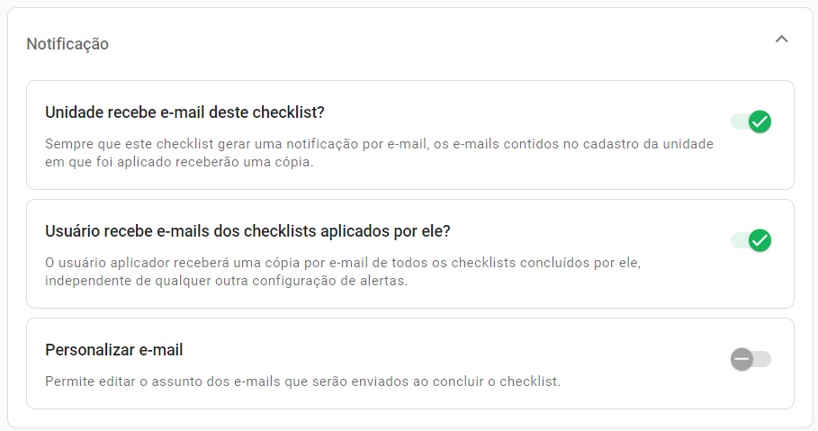 ➕ Dica: Ainda na aba de Dados Cadastrais é possível configurar notificações por e-mail para unidades e usuários vinculados. Você também pode personalizar o assunto dos e-mails enviados ao concluir o checklist.