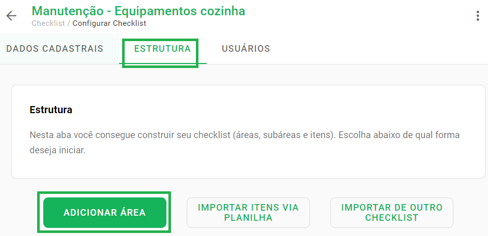A aba Estrutura é onde você adicionará perguntas e complementos. É esta parte que será avaliada pelo usuário aplicador.