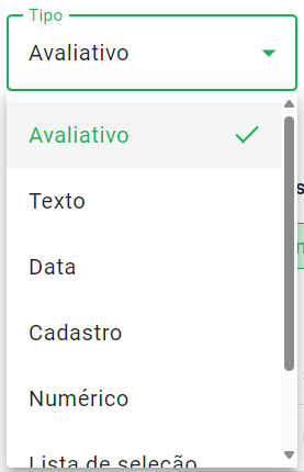 - Tipo: Define como o item será respondido. Existem 7 opções: