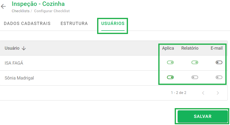 Na aba Usuários, você vincula quem poderá ver ou aplicar este checklist. Habilite as caixas correspondentes aos usuários ou funções desejadas e clique em Salvar.