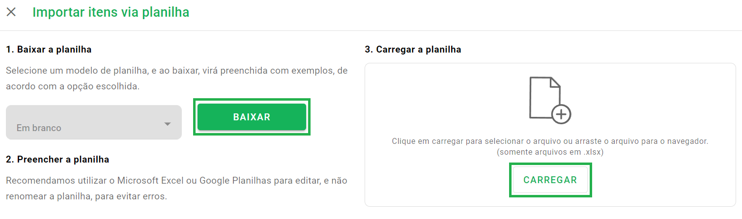 Baixe o modelo em branco, preencha (recomendamos Excel ou Google Sheets) e carregue o arquivo de volta no sistema.