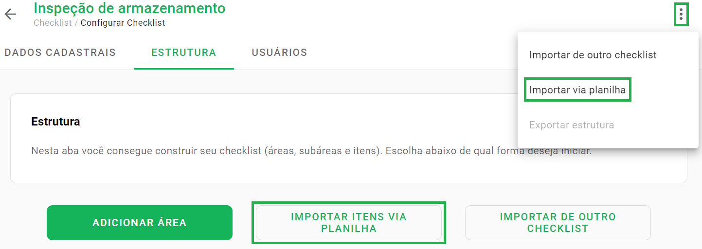 1. Importar via planilha: Na aba Estrutura, clique no ícone de importação e selecione "Importar via planilha".