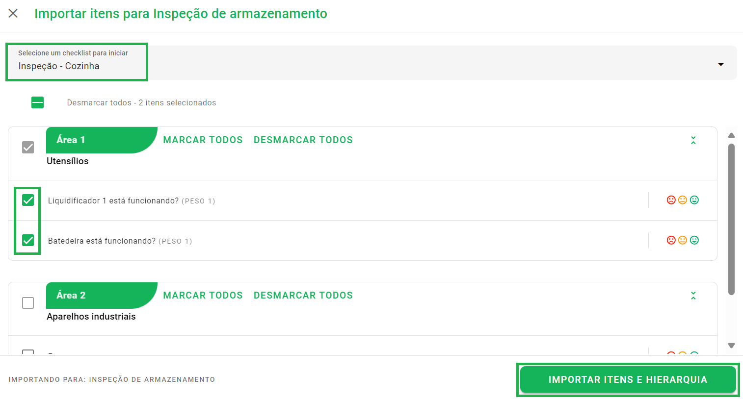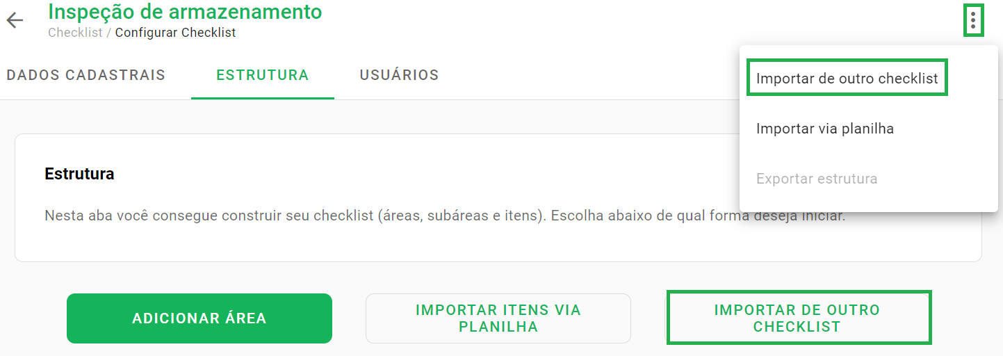 2. Importar de outro checklist: Selecione a opção "Importar de outro checklist", escolha a origem e marque os itens desejados.