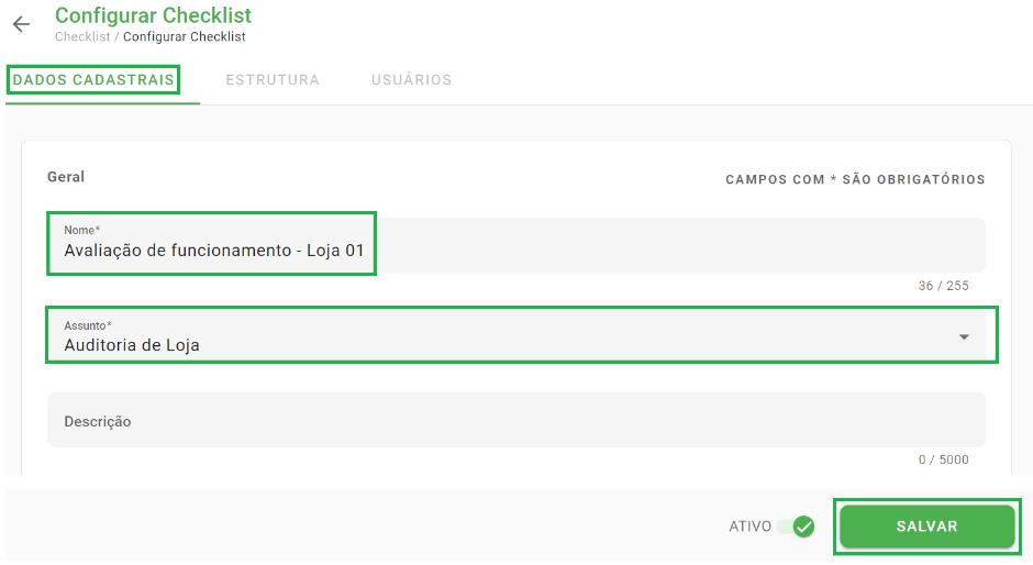 Finalize adicionando uma descrição do checklist (opcional) para apoiar os aplicadores. Após finalizar, deixe o checklist como ativo e clique em Salvar.