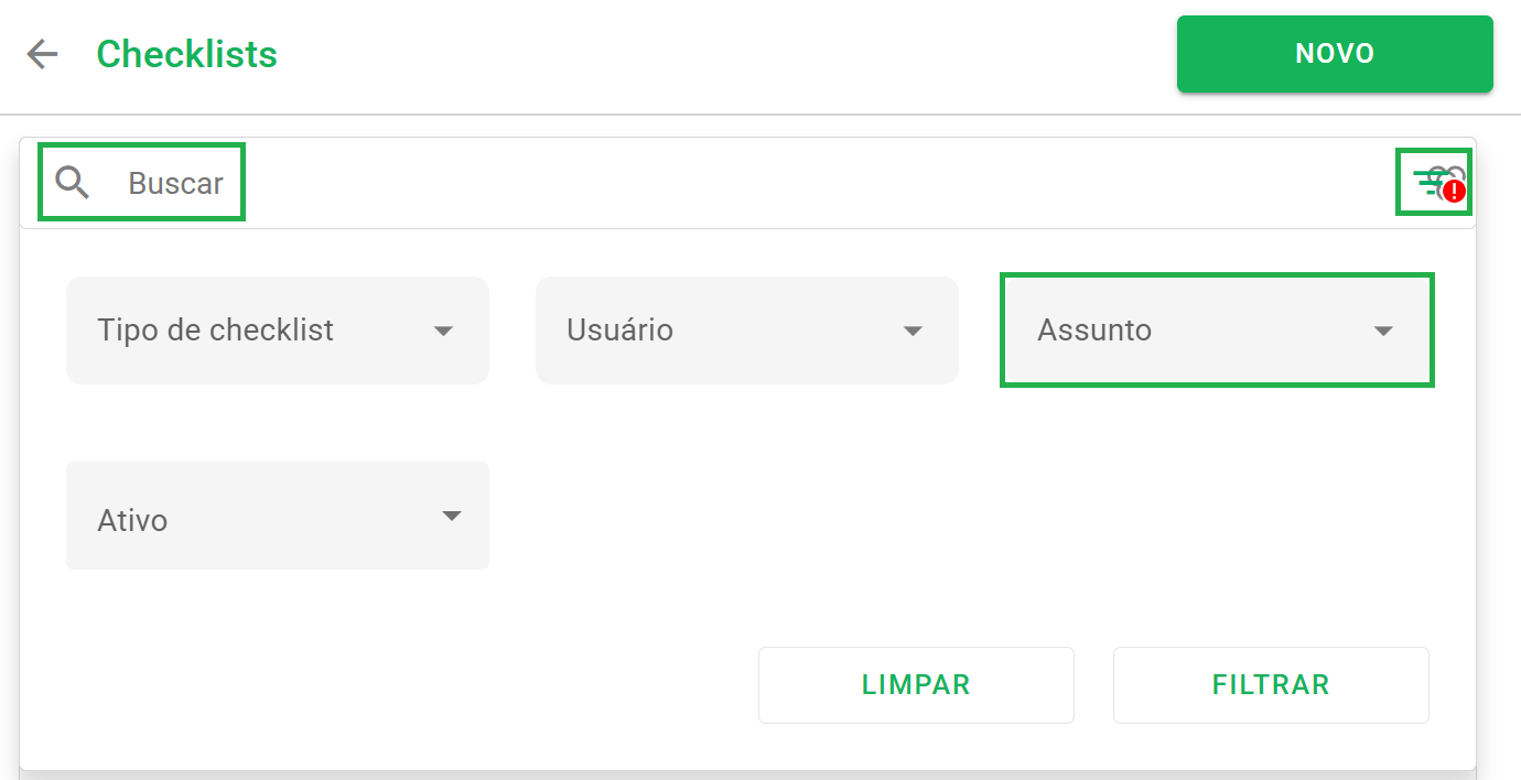 - (1) Novo: ao clicar neste botão, abrirá uma página com várias opções, incluindo Novo Checklist. Aqui é possível criar a sua avaliação com os itens e etapas que você precisa.