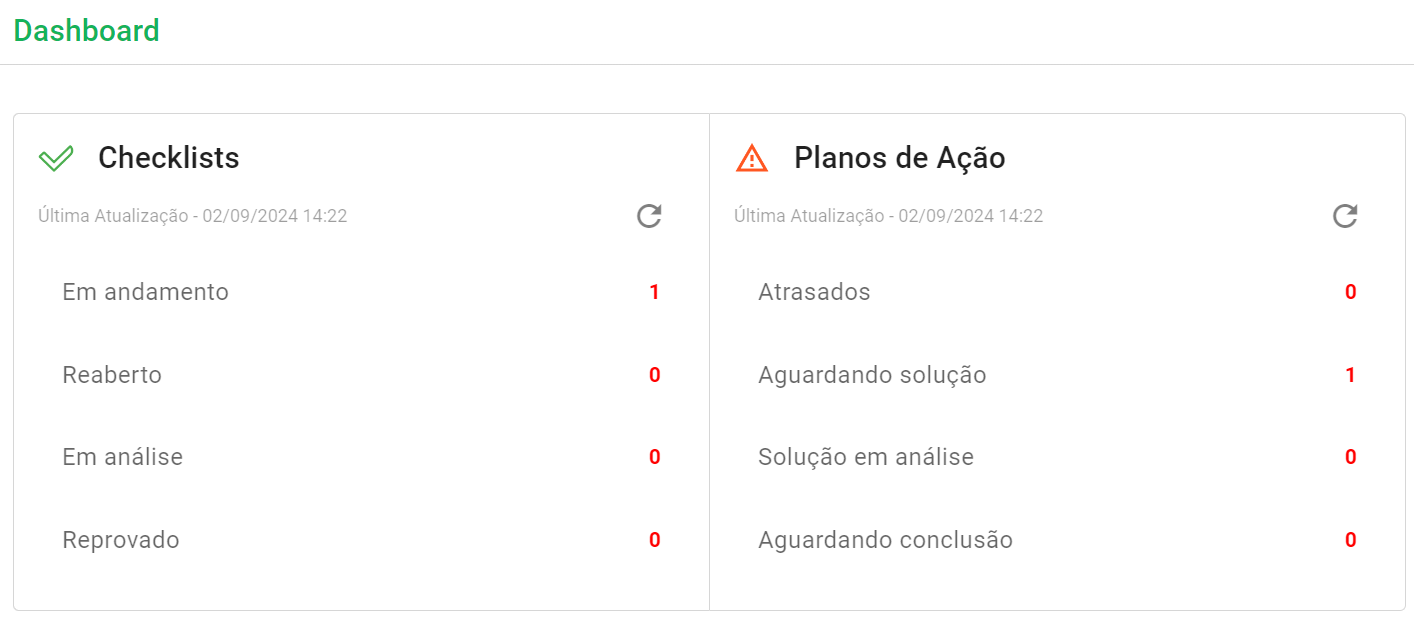 Ao clicar em Dashboard, você terá acesso a dois painéis nativos: Checklists e Planos de ação.