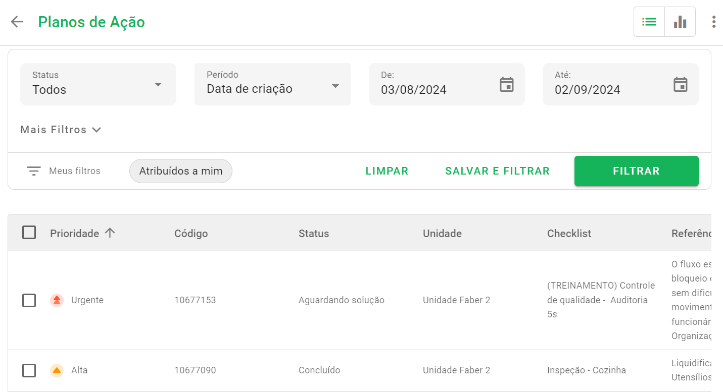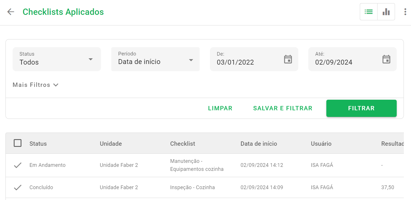 ? Dica: Utilize os filtros na parte superior da tela para verificar os status e o período de aplicação dos seus checklists.