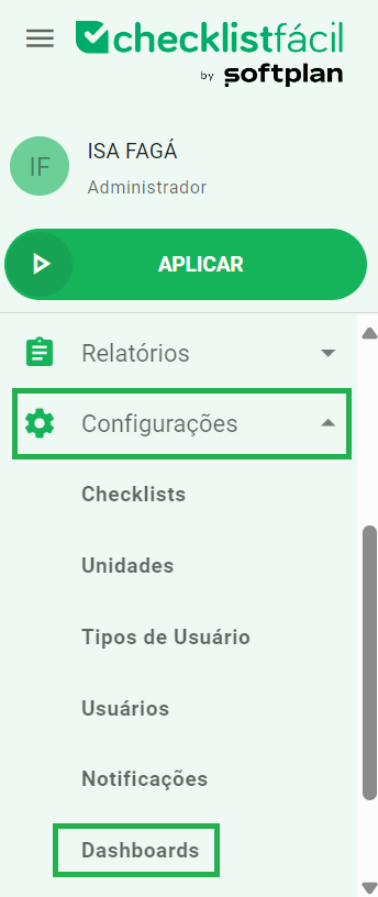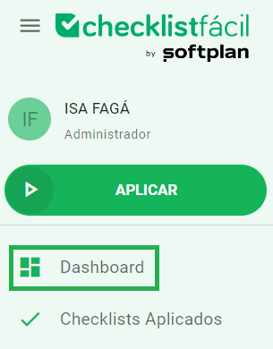 Os dashboards podem ser acessados pelo menu lateral esquerdo do sistema Checklist Fácil: