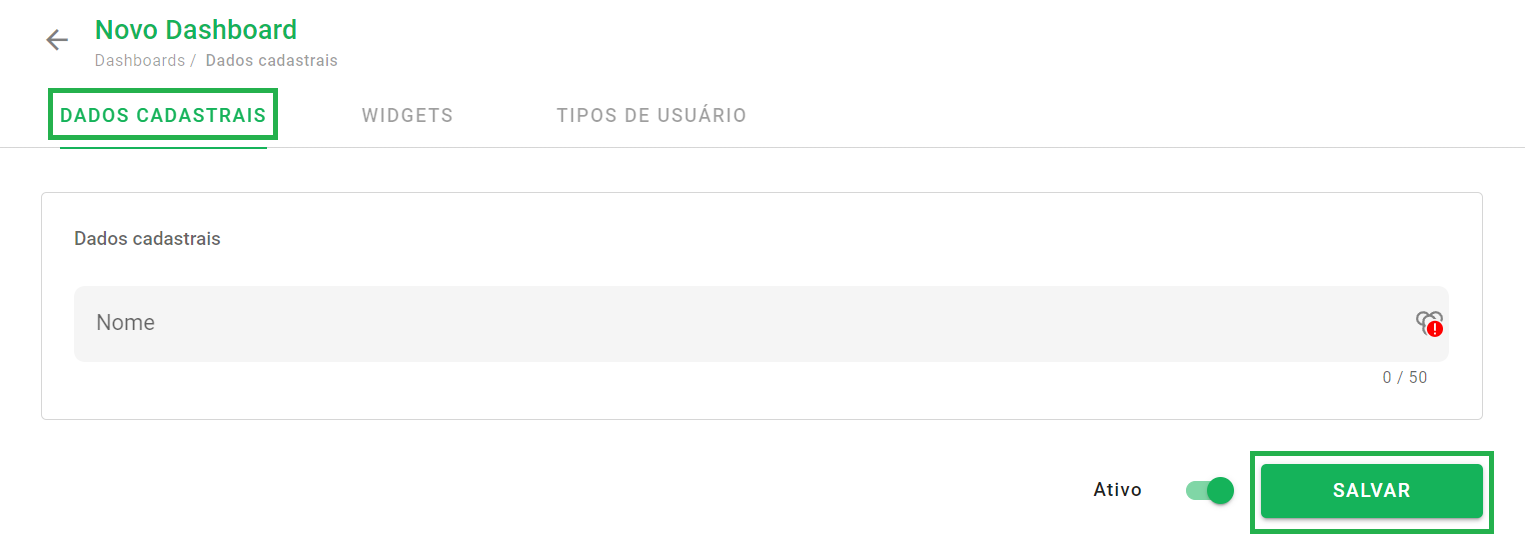 Passo 3: Na aba de Dados Cadastrais, insira um nome descritivo para o seu novo dashboard, deixe-o ativo e clique em salvar.