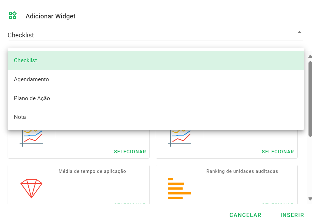 É possível adicionar widgets relacionados aos checklists, agendamentos, planos de ação e notas.