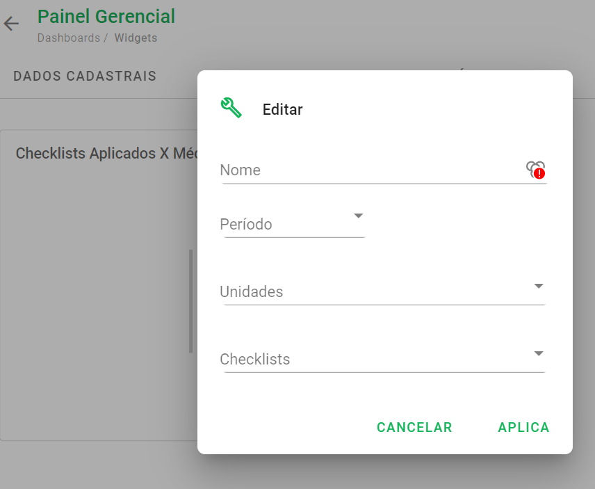 Personalize o nome do gráfico, defina o período de visualização (ex: últimos 7 dias) e selecione as unidades e checklists desejados. Clique em Aplicar.