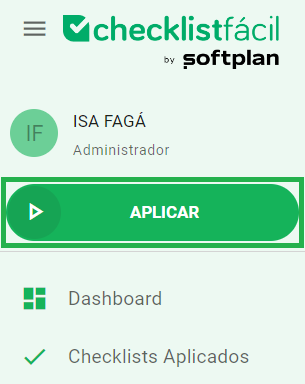 Aplicar um checklist é muito simples. Assim que você faz o login no Checklist Fácil, é possível visualizar o botão de Aplicar no menu lateral esquerdo da tela, como destacado a seguir.