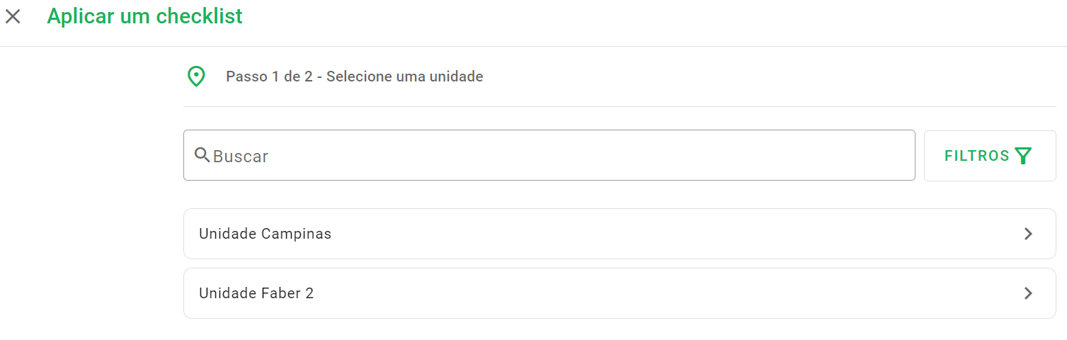 Caso não encontre uma unidade ou checklist, é possível que esses recursos não foram liberados para você. Neste caso, é necessário que o seu usuário seja vinculado à unidade e ao checklist correspondentes.