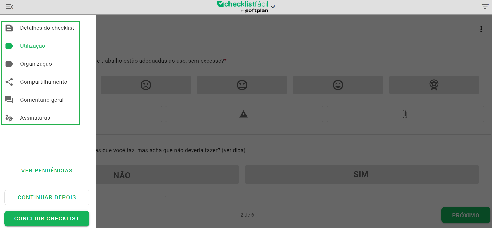 Normalmente, a sequência da aplicação acontece na ordem mostrada no menu lateral, mas nada impede que você continue a aplicação deste checklist em outro momento, caso esta configuração esteja habilitada.