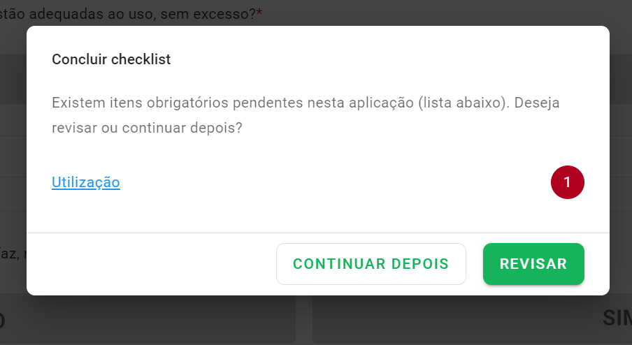Neste caso, aparecerá uma mensagem indicando qual o item e qual a pendência que deve ser preenchida.