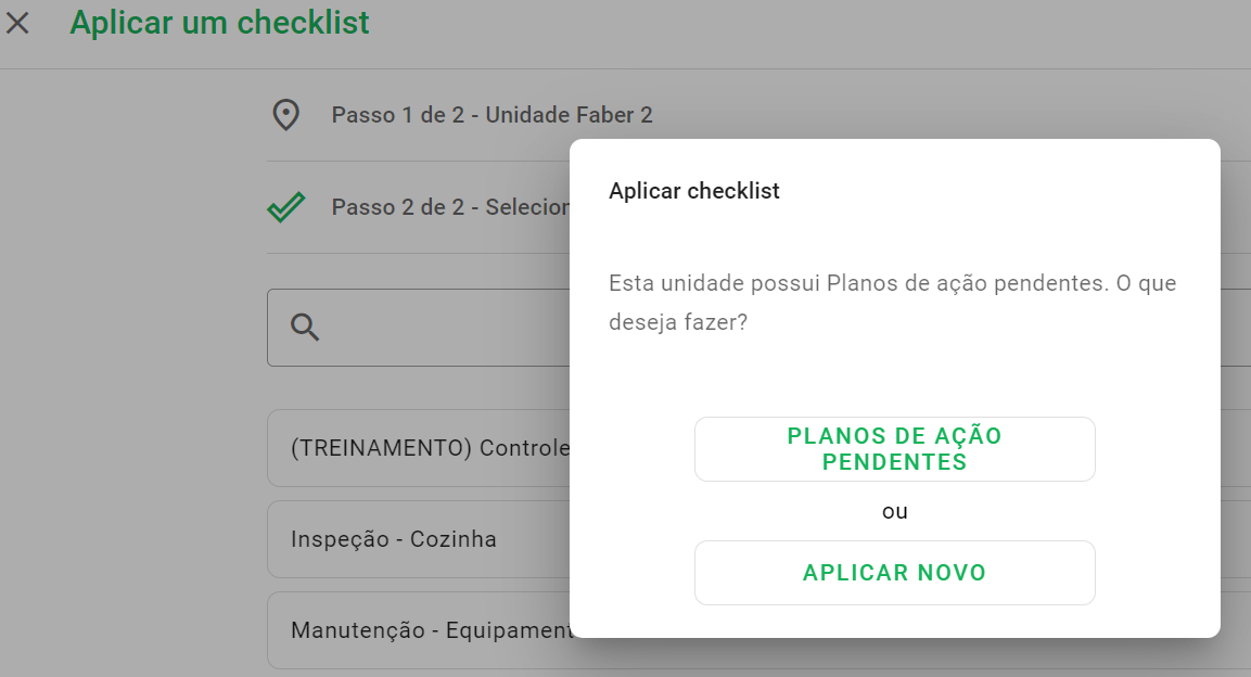 Quando existem planos de ação pendentes relacionados ao checklist que você vai aplicar, pode aparecer a seguinte mensagem: