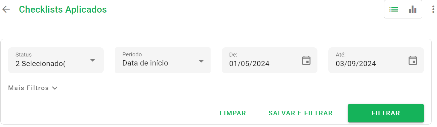 Utilize os filtros de status e período para encontrar o checklist que deseja.