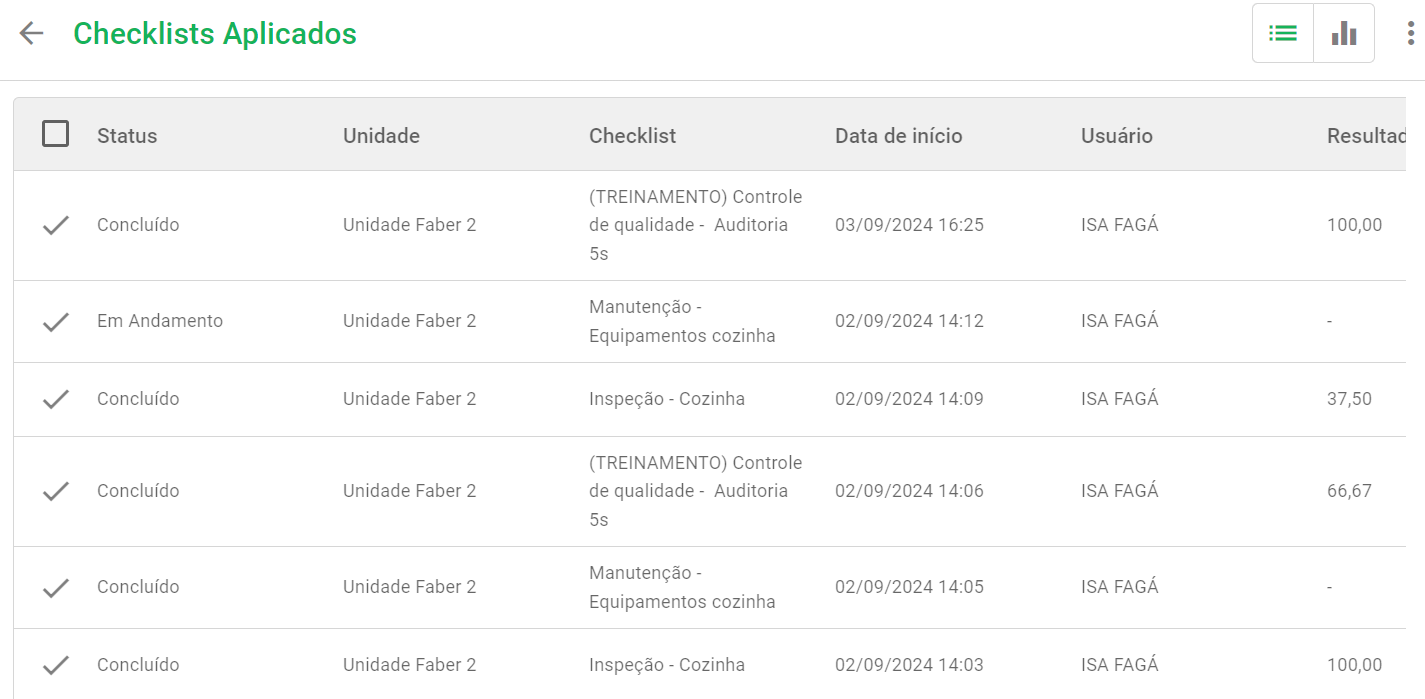 Ao clicar em Filtrar, aparecerá uma lista com todos os checklists, assim como informações sobre eles, tais como: status, unidade, checklist, data de início, usuário aplicador e resultado.