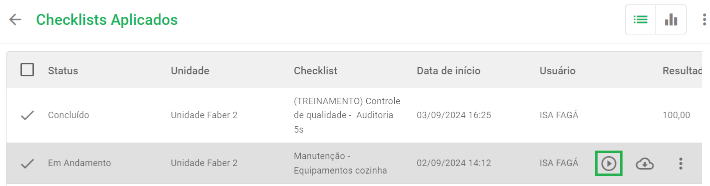 Caso você identifique um checklist que esteja com o status em andamento e queira continuar a sua aplicação, passe o mouse sobre ele e clique na setinha Continuar avaliação, como na imagem abaixo: