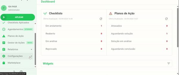 Para visualizar os checklists que já foram aplicados, vá até o menu lateral esquerdo do sistema e clique em Checklists Aplicados.
