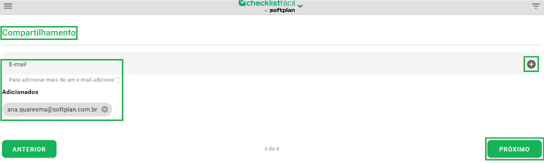 Para adicionar, responda os itens corretamente até chegar na área de conclusão, mais precisamente na página de Compartilhamento. Nela, coloque o(s) endereço(s) dos quais gostaria de compartilhar o resultado no campo E-mail, e clique no ícone + para adicioná-los. Quando finalizar, selecione próximo e continue a etapa de conclusão do checklist.