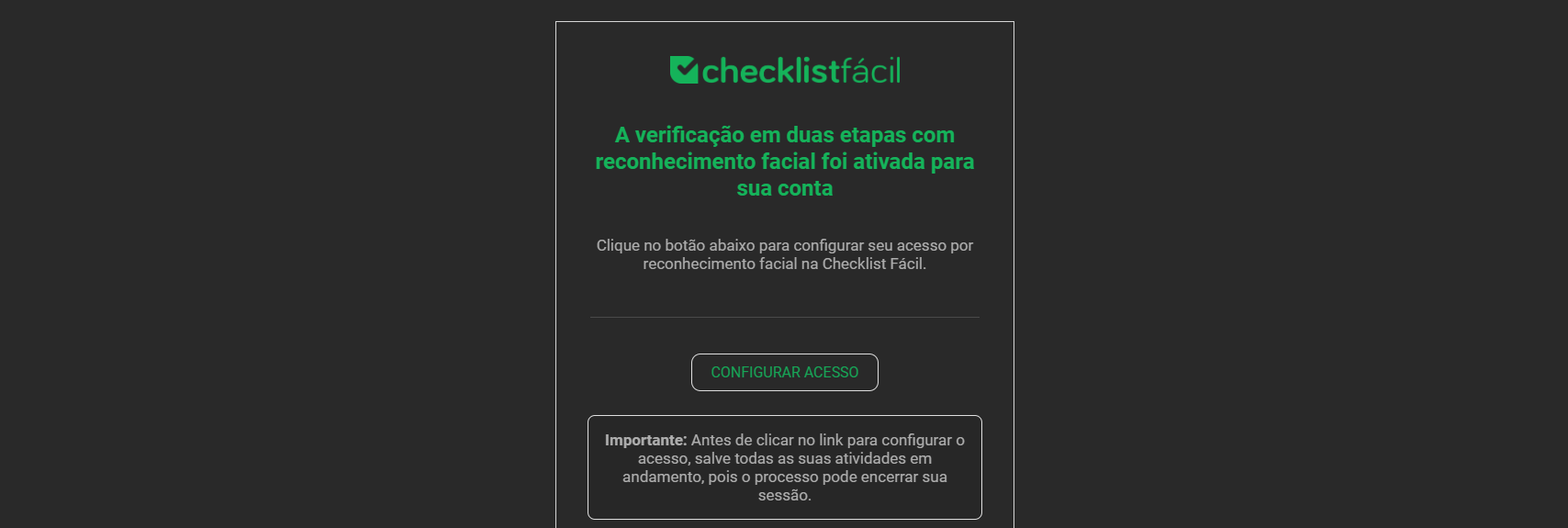 Com a ativação da funcionalidade Verificação em duas etapas para todos os usuários em conjunto com a opção Verificação em duas etapas por reconhecimento facial para todos os usuários, cada usuário deverá configurar seu acesso por meio do reconhecimento facial. Isso pode ser feito através do e-mail recebido no ato da ativação da funcionalidade, que é disparado para todos os usuários cadastrados, ou no próximo login no sistema realizado pelo usuário.