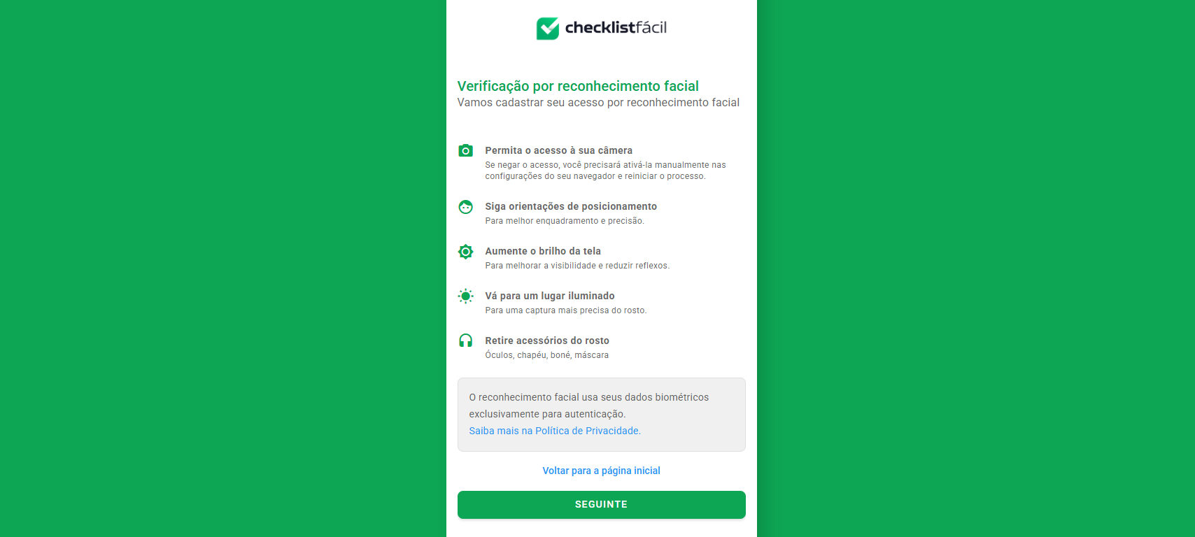 Clicando no botão Configurar acesso no e-mail recebido, ou no próximo acesso ao sistema, o usuário será redirecionado para as instruções antes de iniciar a captura facial. Nessa etapa, o usuário será orientado a buscar um ambiente bem iluminado e seguir as orientações à risca.