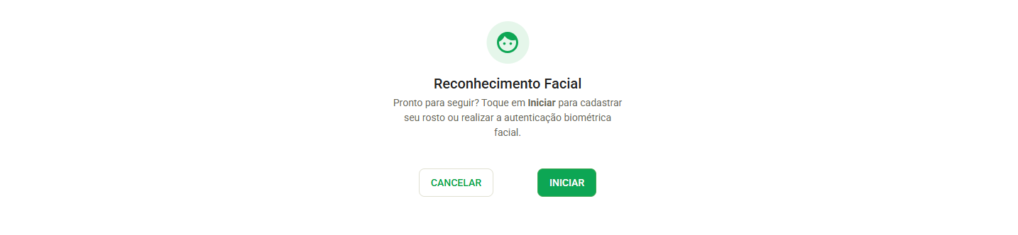 Após registrar o rosto de referência, no próximo acesso em que a autenticação for solicitada, o usuário será direcionado para a tela de Reconhecimento Facial. Assim como no cadastro inicial, deverá clicar em Iniciar e seguir as instruções exibidas pelo sistema.