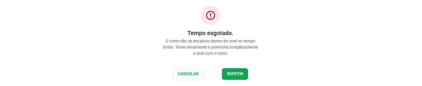 Caso o sistema não consiga identificar o rosto ou as instruções não sejam seguidas, o sistema irá interromper a captura e o usuário pode Repetir o processo.