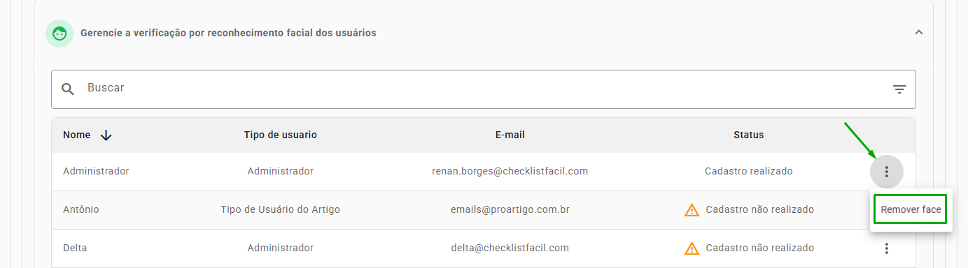 Na tela de Métodos de verificação (Configurações > Configurações avançadas > Segurança > Verificação em duas etapas), com o quadro Gerencie a verificação por reconhecimento facial dos usuários expandido, você pode remover a face cadastrada do usuário clicando nos três pontinhos ao lado direito do usuário desejado e depois em Remover face.