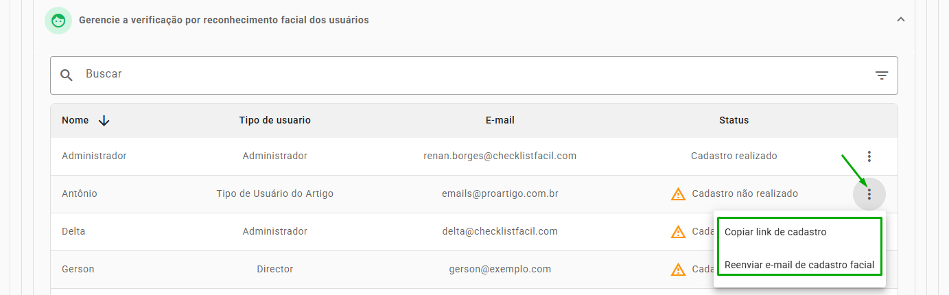Caso o usuário ainda não tenha cadastrado seu reconhecimento facial, é possível reenviar o link para cadastro via e-mail ou copiar o link para ser encaminhado para o usuário manualmente.