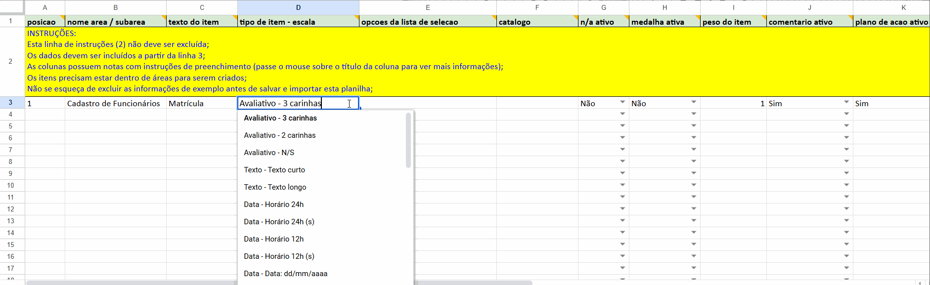 - Na coluna tipo de item - escala, preencha com: Especial - Catálogos - Seleção única;