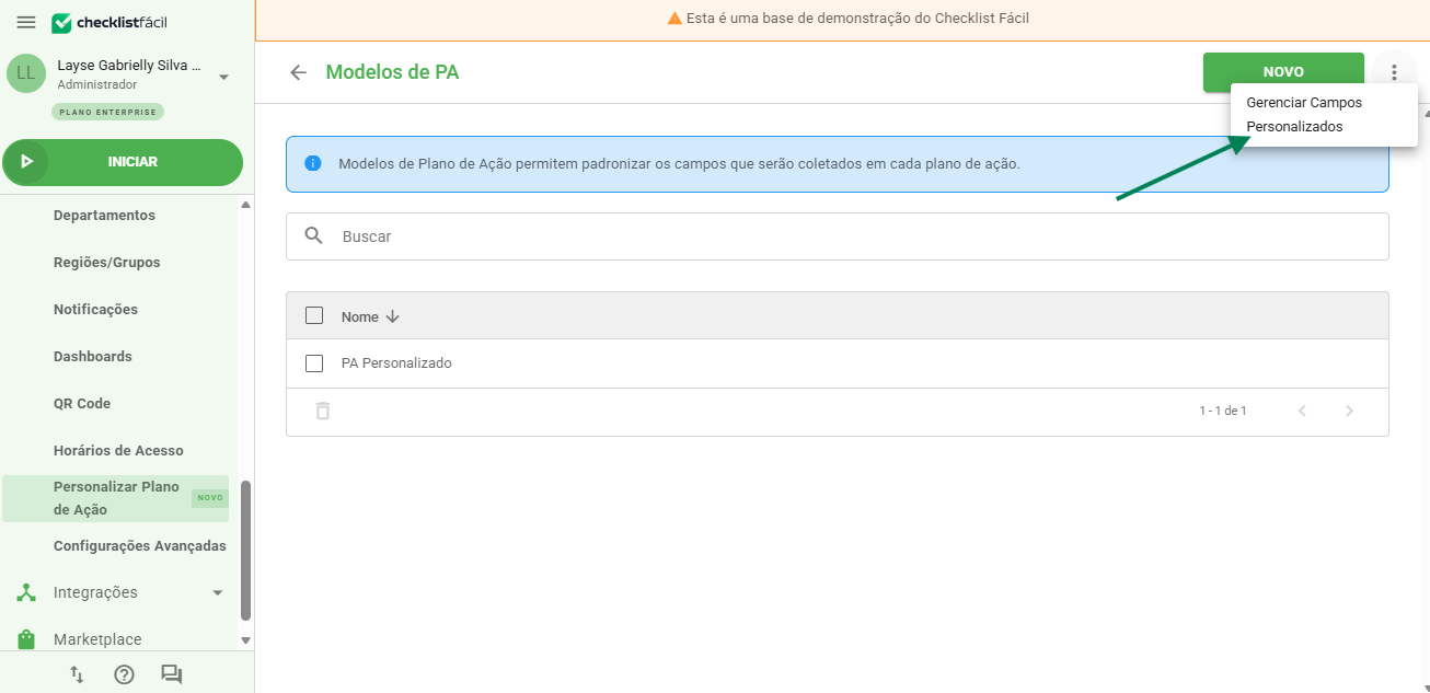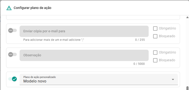 Basta acessar as configurações do botão de Plano de Ação dentro do seu checklist, habilitar a opção "Personalizado" e selecionar o modelo que você acabou de criar.