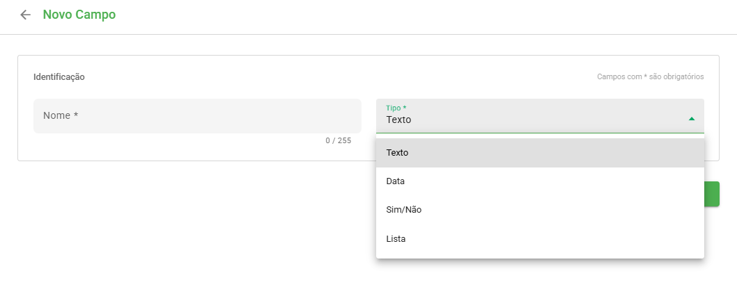 Ao clicar em Novo, você escolhe o nome do campo e o tipo de resposta que o usuário deve fornecer: