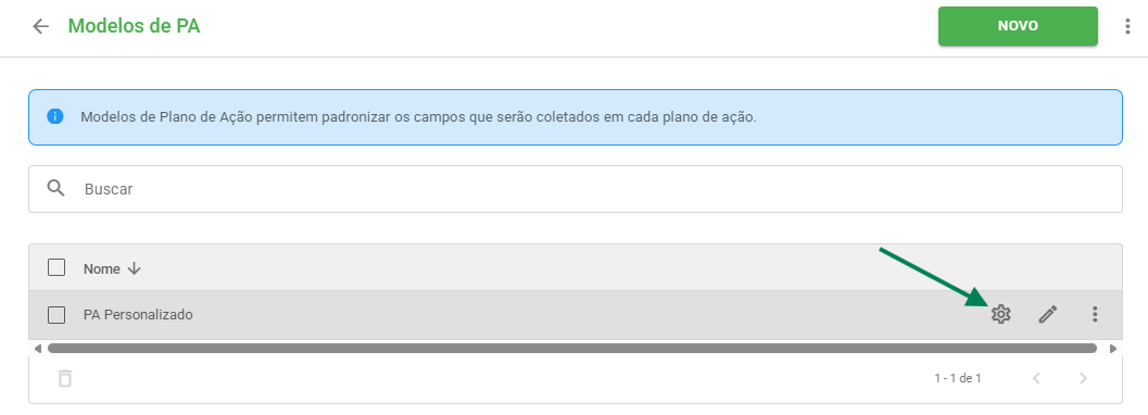 Com seus campos criados, é hora de montar o modelo que sua equipe visualizará. Acesse Configurações > Personalizar Plano de Ação > Novo.