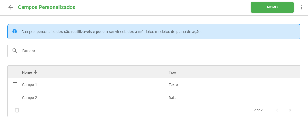 O módulo de Plano de Ação Personalizado é uma funcionalidade do plano Enterprise. Para utilizar estas configurações, o recurso deve estar ativo em sua conta; caso ainda não visualize as opções, entre em contato com seu Gerente de Contas (CS) para solicitar a ativação na base.Biblioteca de campos personalizados