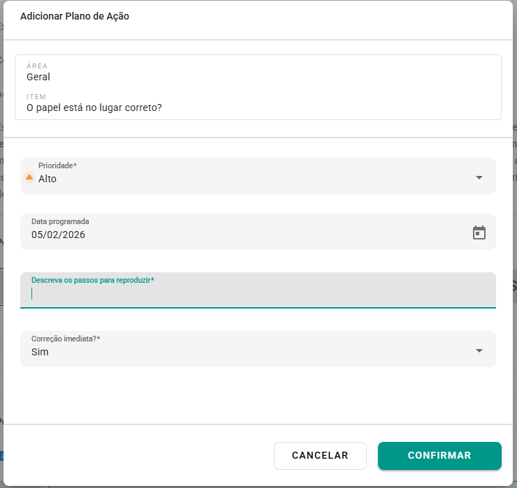 O módulo de Plano de Ação Personalizado foi criado para que sua empresa tenha total autonomia na hora de tratar não conformidades. Com ele, você define exatamente quais informações sua equipe deve coletar, adaptando o sistema ao seu processo operacional de forma simples e intuitiva.