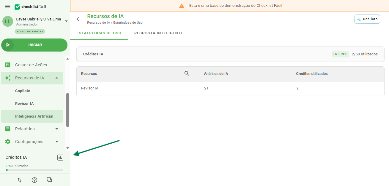 Você pode acompanhar o saldo de créditos diretamente na versão WEB do Checklist Fácil. Na barra lateral, é exibido o widget de Créditos IA com o saldo atual e o quanto já foi utilizado no período.