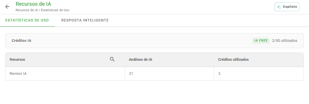 Ao acessar a tela de Estatísticas de Uso, é possível visualizar o detalhamento completo do consumo, identificando exatamente quanto cada funcionalidade (como a Resposta Inteligente ou o Revisor IA) consumiu do seu saldo total.