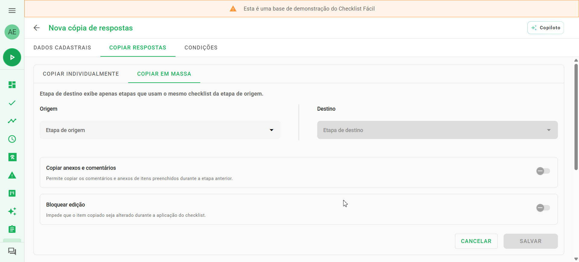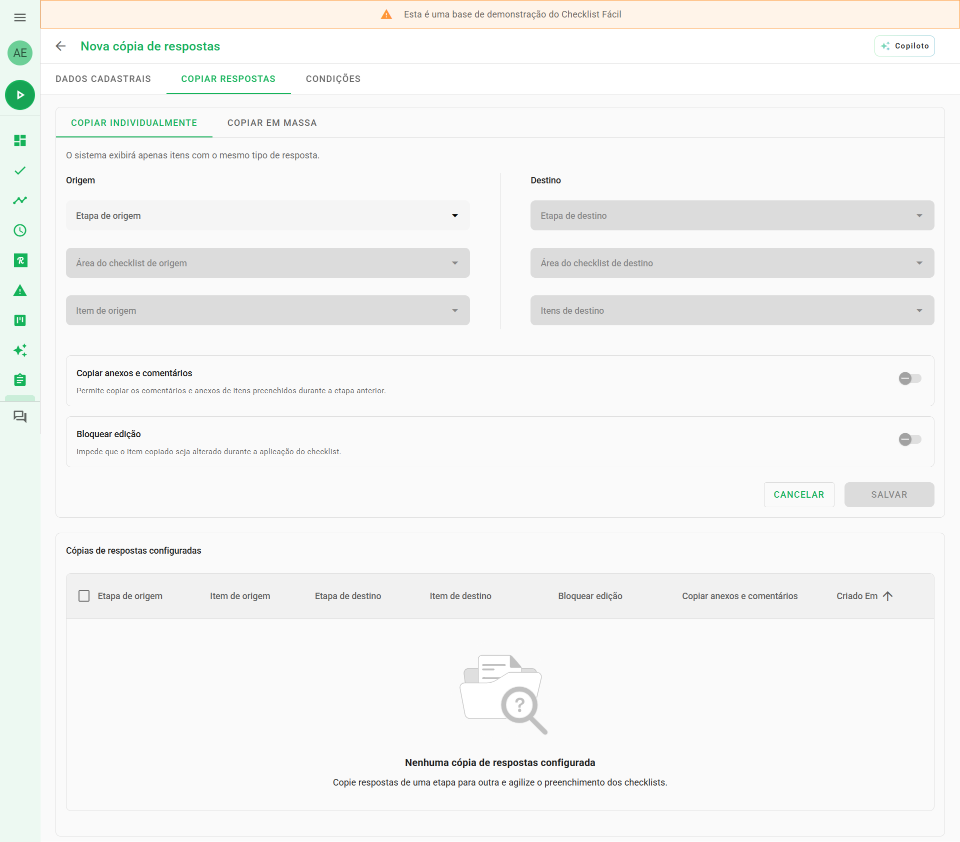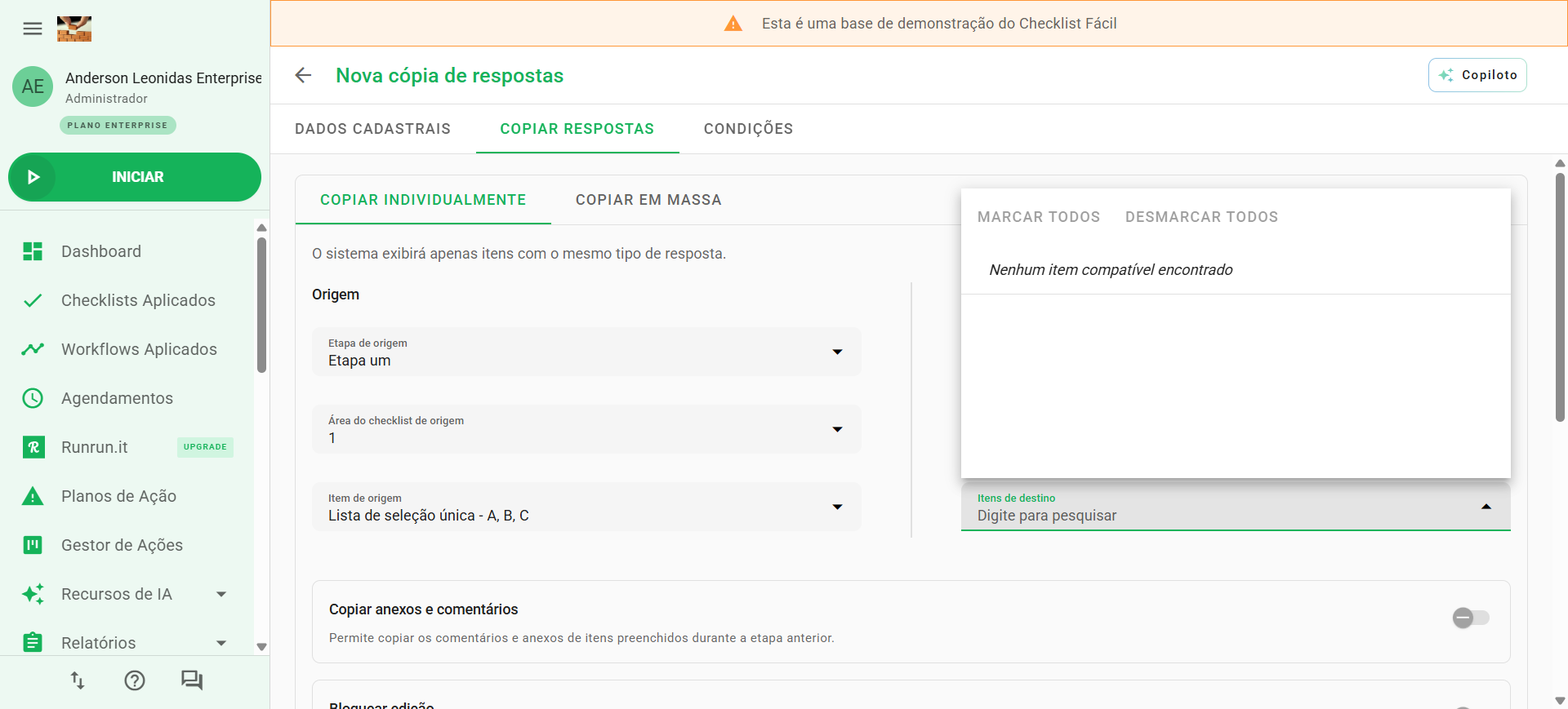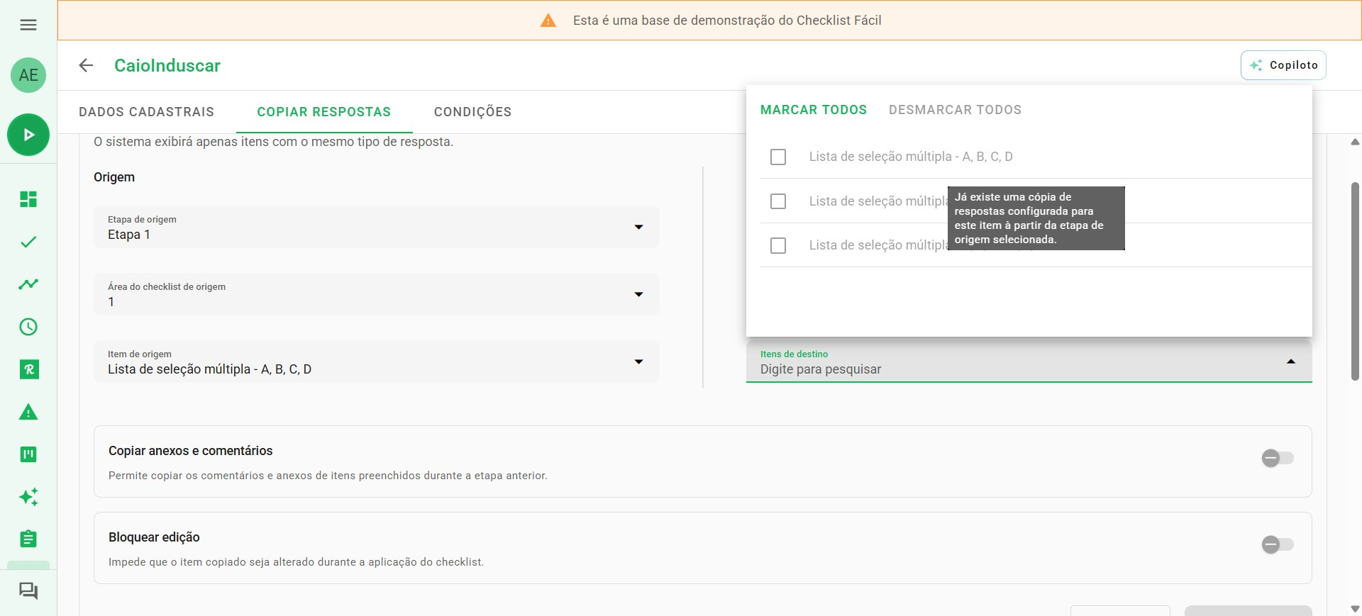 O sistema permite copiar respostas apenas entre itens que possuam o mesmo tipo de resposta, como texto para texto ou número para número.