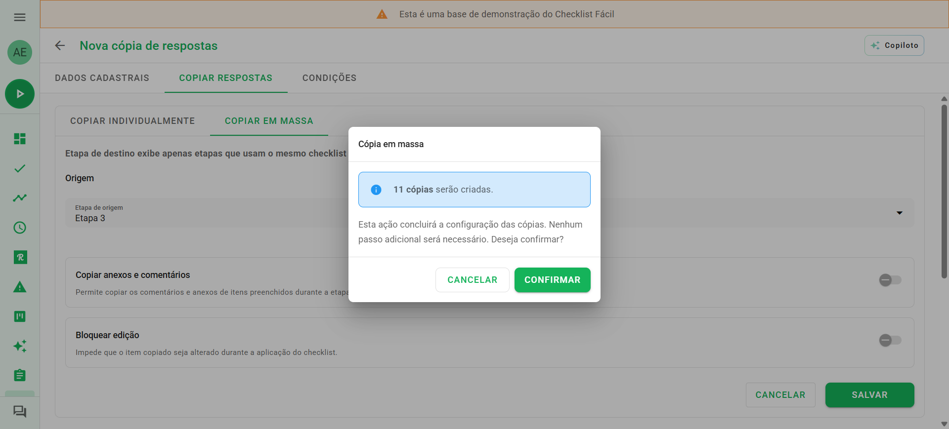 Ao salvar, será exibida uma modal de confirmação detalhada informando quantos itens foram analisados, quantas cópias serão criadas, quantas serão ignoradas (por já existirem) e quantos itens são incompatíveis.
