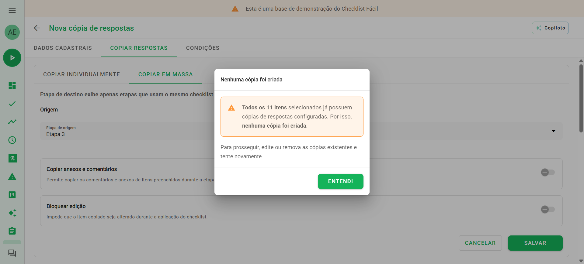 Caso nenhum item seja compatível, o sistema avisará: "Nenhum dos itens da etapa de origem possui item compatível na etapa de destino. Por isso, nenhuma cópia foi criada."