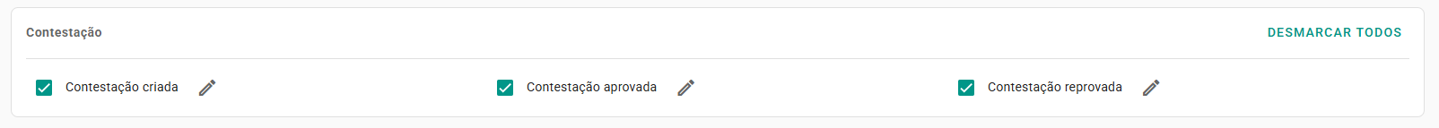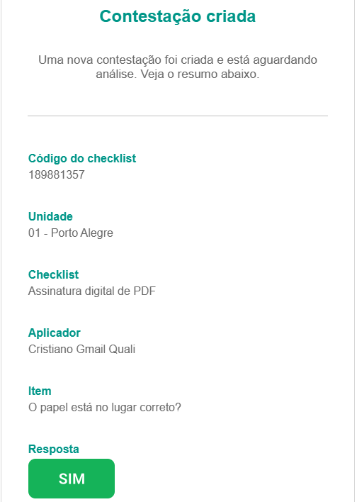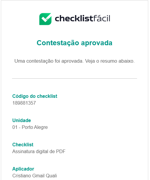 - Contestação criada: Notifica aprovadores vinculados ao checklist quando uma nova solicitação é aberta.