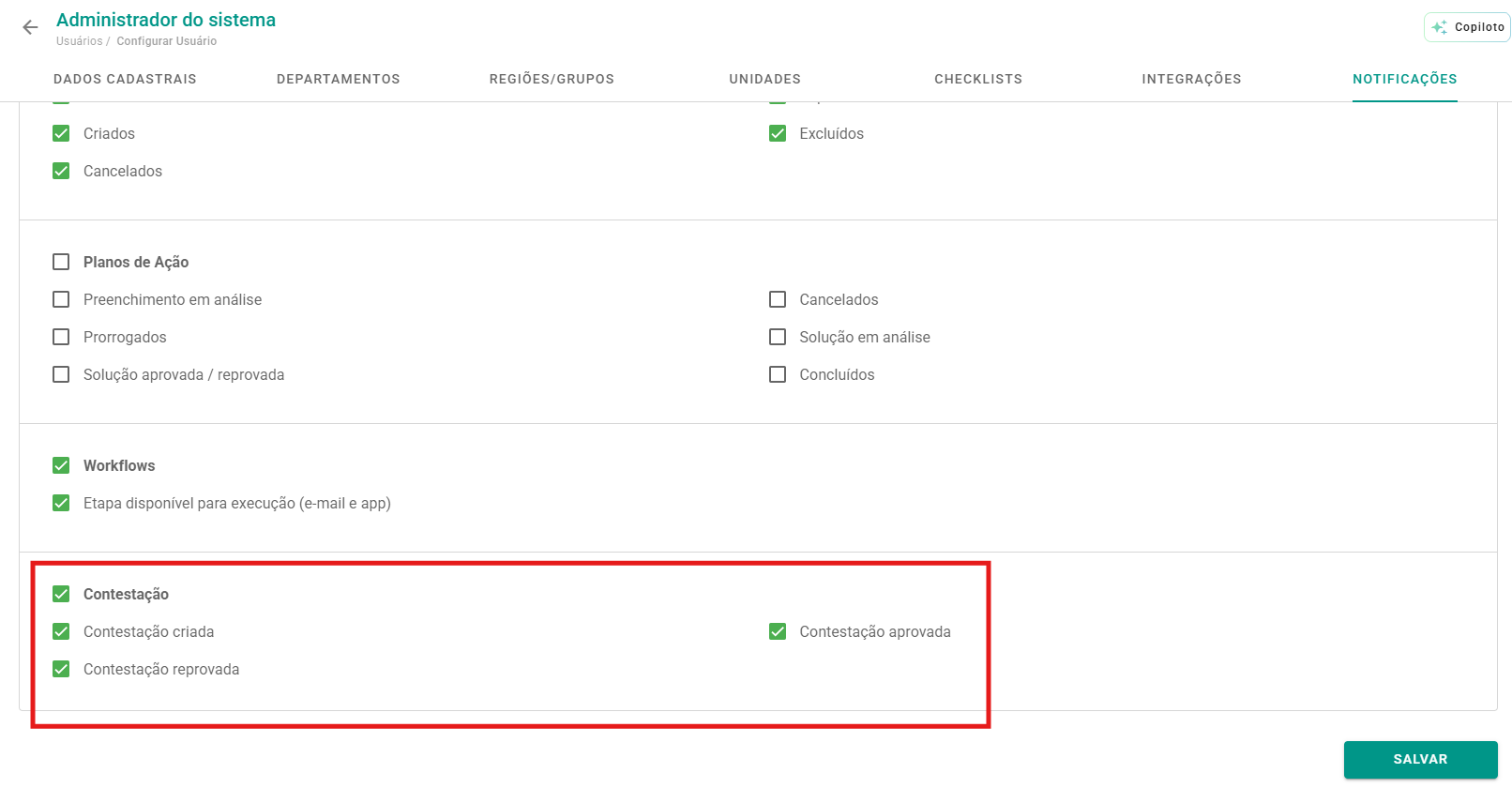 Para habilitar o envio para um grupo de usuários de forma massiva, siga o caminho: Configurações > Notificações > Selecionar tipo de usuário > Contestação.