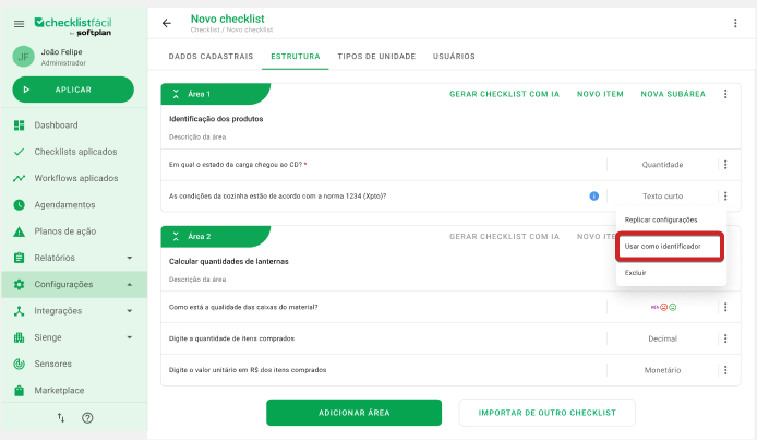 Passo 1: Acesse a edição do checklist e localize o item desejado. Clique no menu de opções do item e selecione "Usar como identificador".