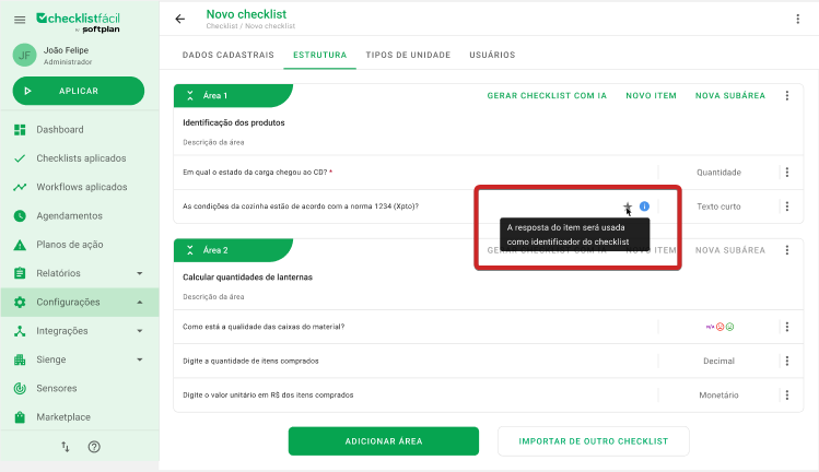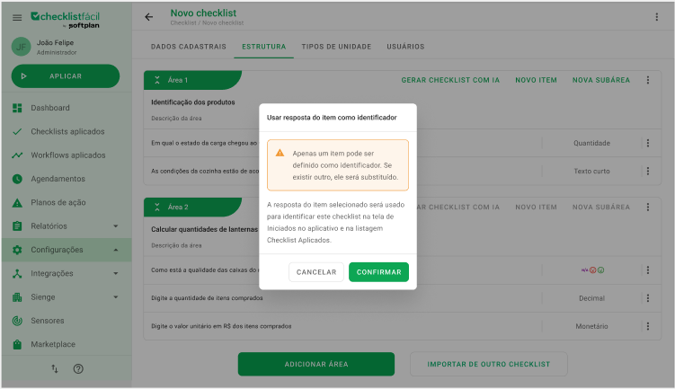 Regras importantes: • Apenas usuários com permissão para editar checklists podem realizar a configuração. • É permitido apenas 1 item identificador por checklist. • Se você definir um novo item como identificador, o anterior é removido automaticamente.