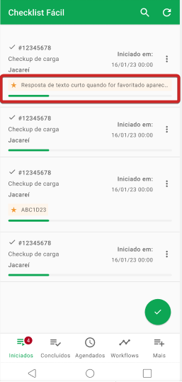 Na lista de checklists iniciados, a resposta aparece abaixo do nome e da unidade, sempre acompanhada de um ícone de estrela. A informação só aparece se o campo já tiver sido preenchido.